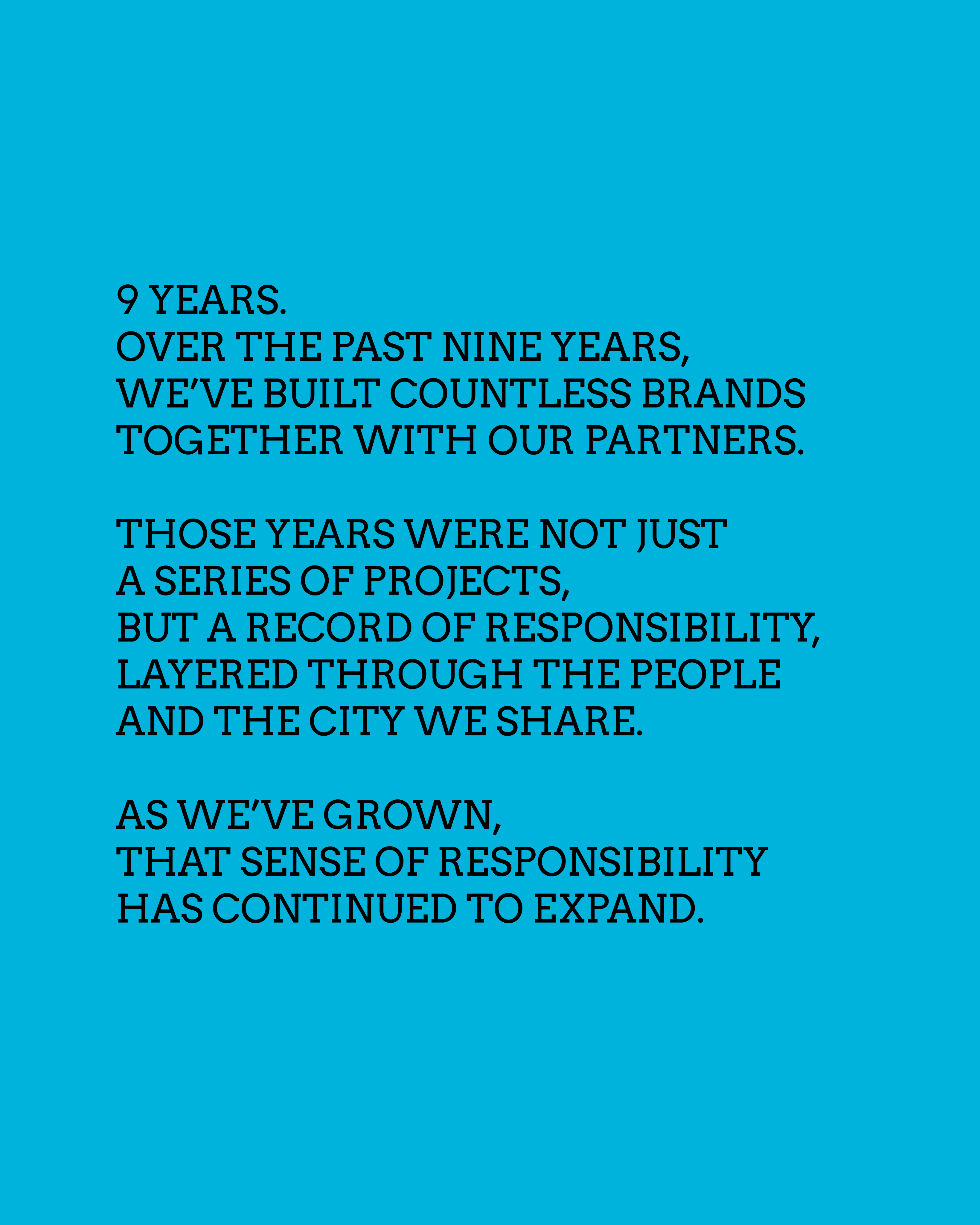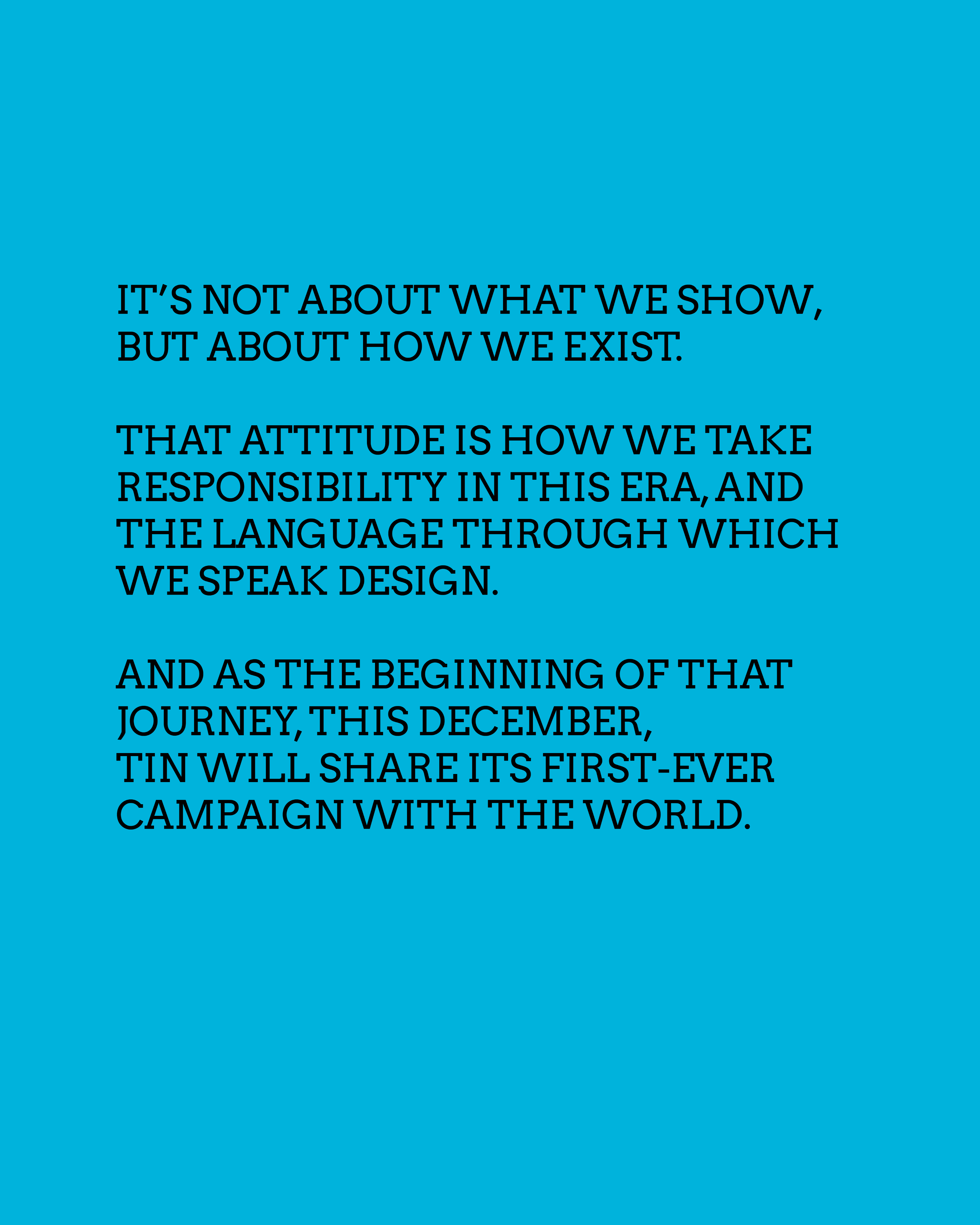 10.28.2025TIN 9주년 입니다.우리는 그동안 수많은 파트너사와 함께 브랜드를 만들어왔습니다.그 시간은 단순한 프로젝트의 연속이 아니라, 한 층씩 쌓여 올라온 우리가 함께하는 도시와 사람에 대한책임의 기록이라 생각합니다.그리고 우리의 성장에 따라,그 책임의 범위는 점점 더 넓어지고 있습니다.보여주는 것이 아닌,어떻게 존재할 것인가에 대한 태도.그것이 우리가 이 시대에 책임을 다하는 방식이며,디자인으로 말하는 우리의 언어입니다.그리고 그 여정의 시작으로,올해 12월, TIN의 첫 캠페인을 공개합니다.