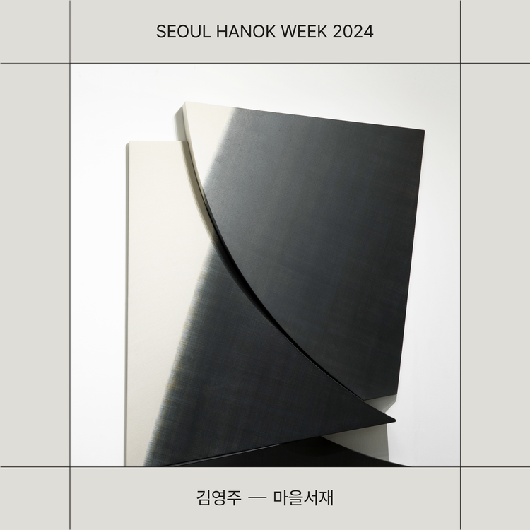 녹색을 배제하고 블랙과 아이보리의 조합으로 한옥의 장엄함, 우아함, 그리고 고요함을 표현했습니다. 선으로 이루어진 단순한 정사각형 그래픽은 공간의 구조를 은유하며, ‘한옥의 공간과 울림’이라는 전시의 주제를 시각적으로 전달했습니다.