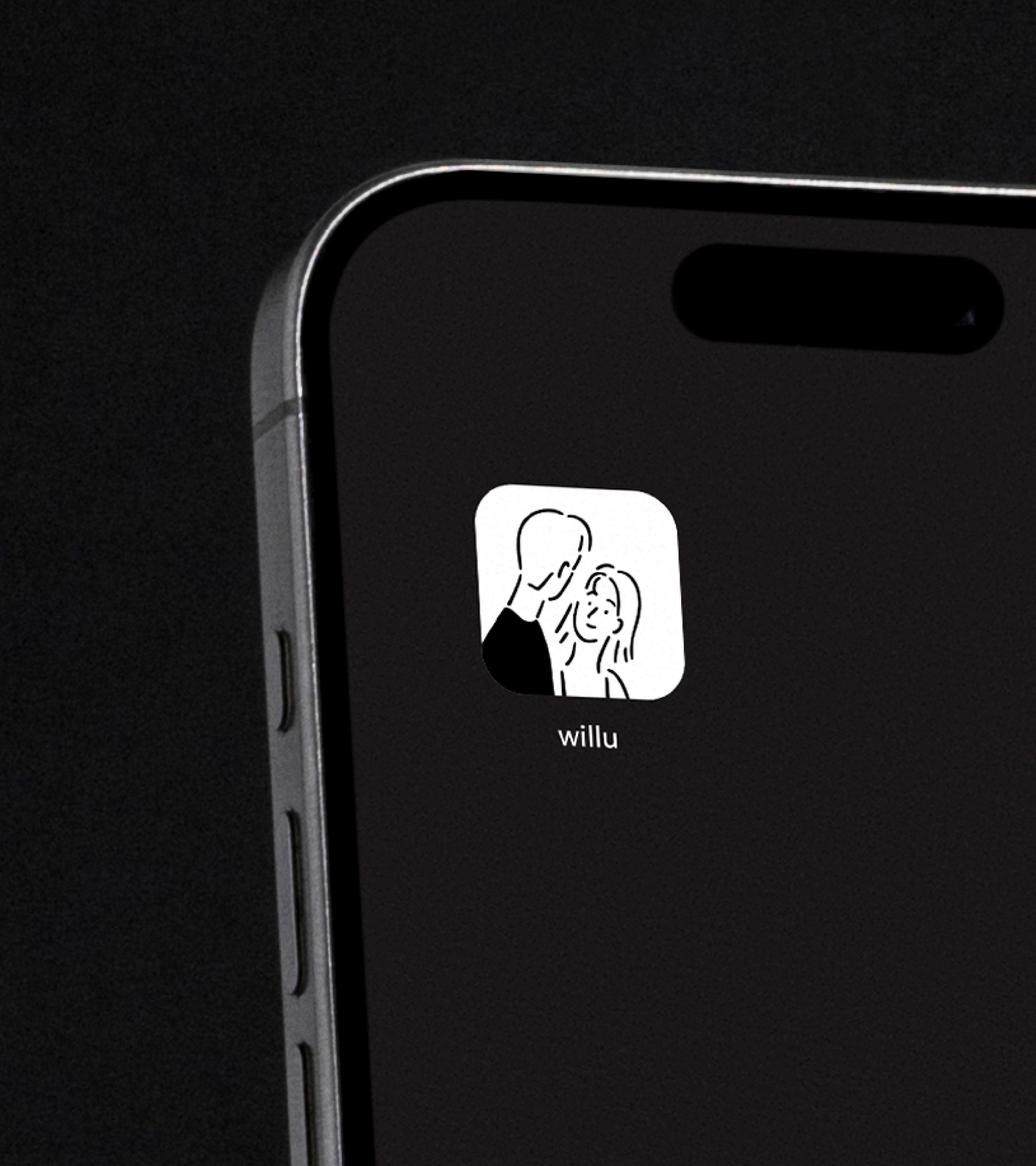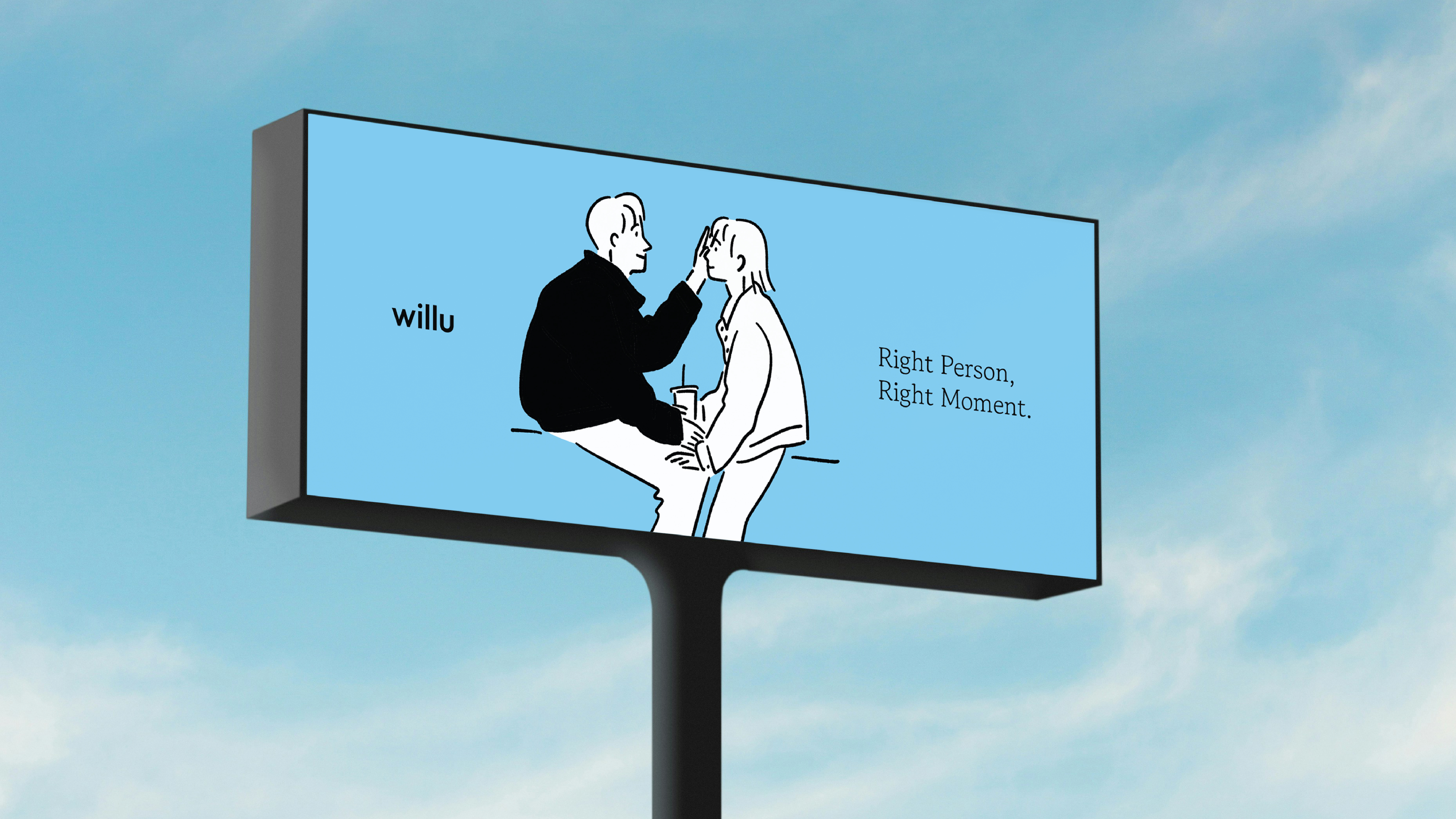 이 프로젝트에서 일러스트레이션은 로고 못지않게 중요한 역할을 했습니다. Willu는 일반적인 데이팅 앱이 아닌, 사람과 사람 사이의 진정성 있는 연결을 지향하는 서비스입니다. TIN은 이러한 차별화된 철학을 시각적으로 설득력 있게 전달하기 위해 기존의 일부 만남 플랫폼에서 흔히 보이는 과도하게 자극적이고 복잡한 시각 언어 대신, 간결한 블랙 라인 드로잉을 통해 사람의 존재감과 감정을 섬세하게 표현했습니다.
